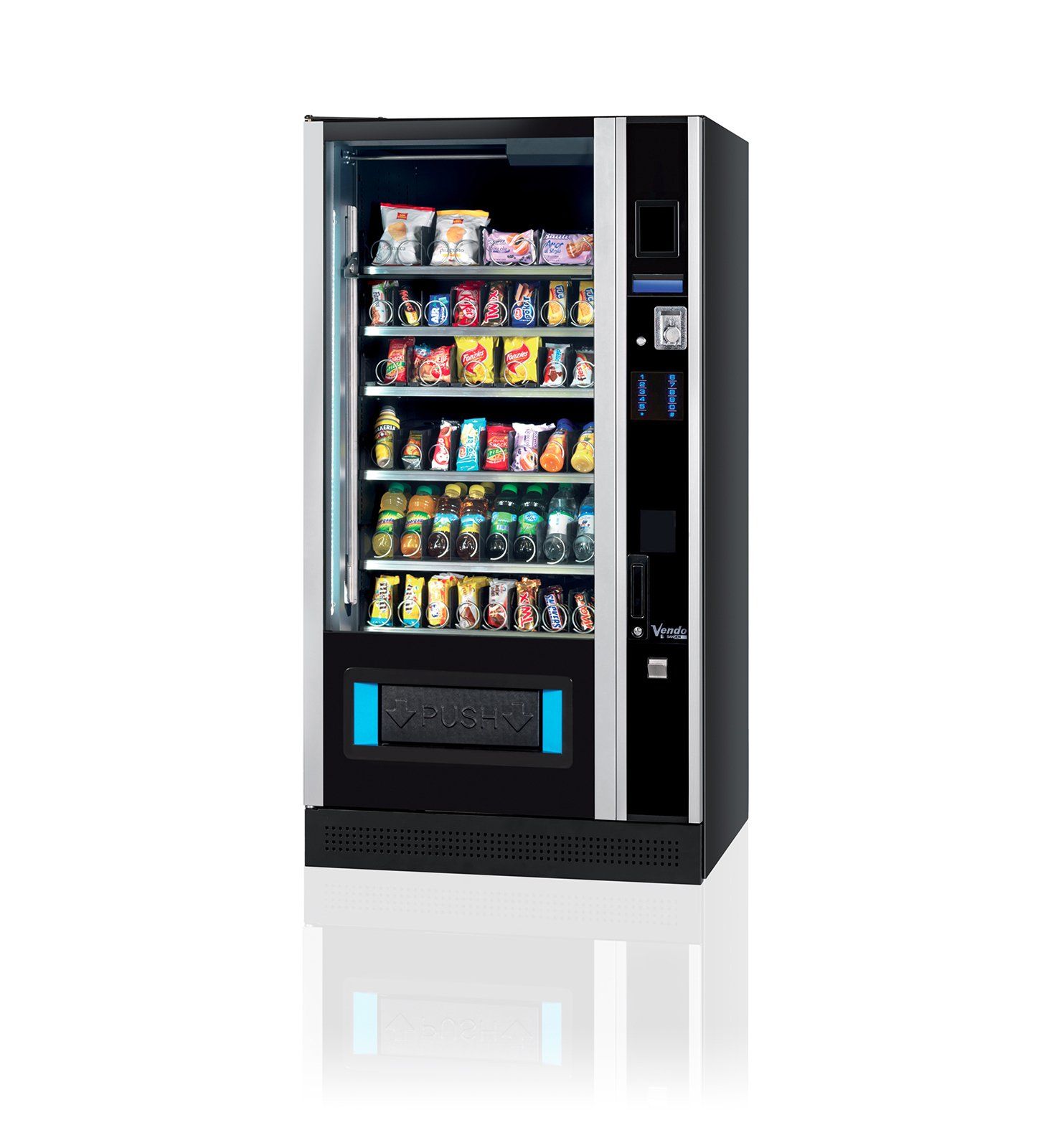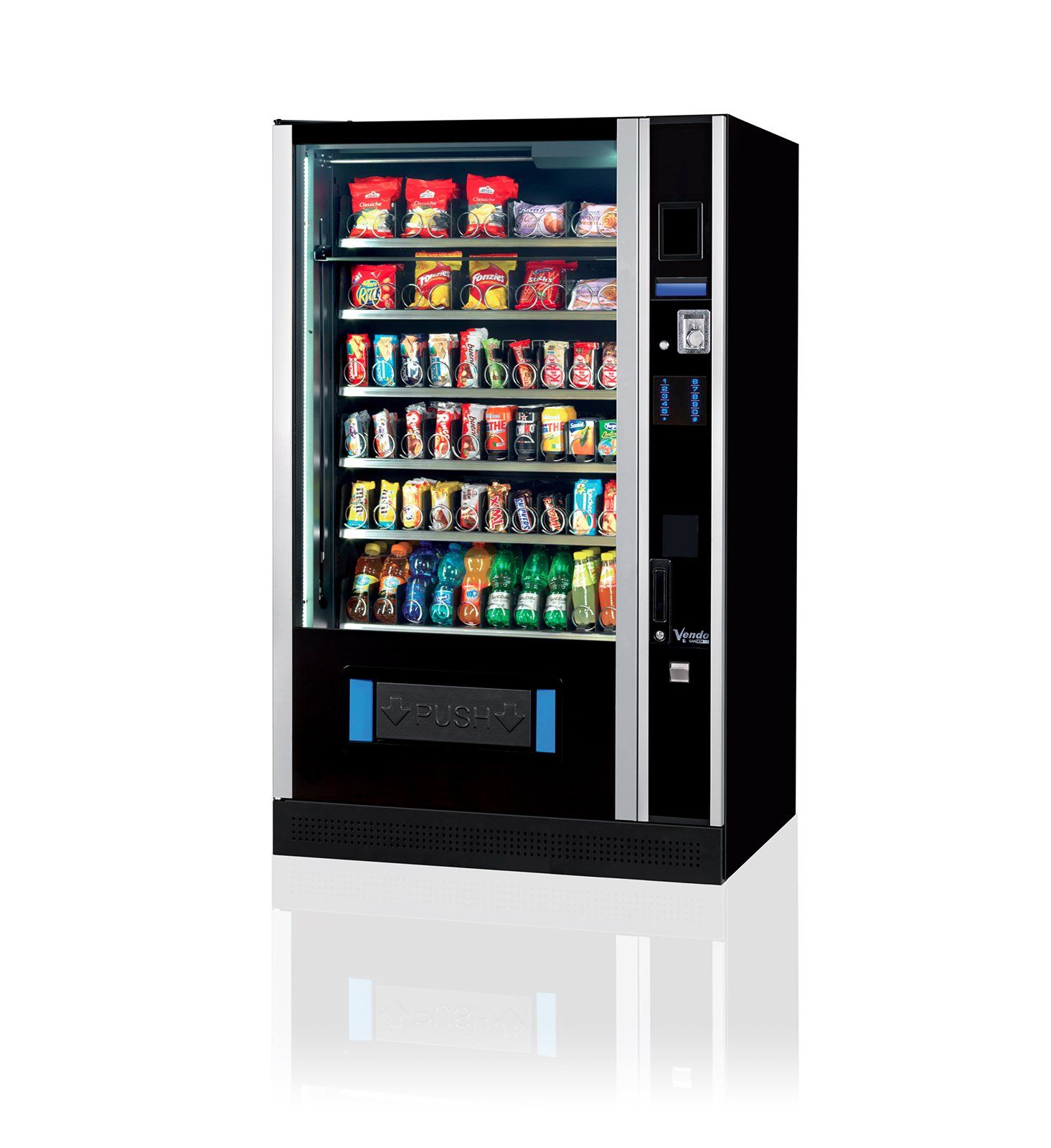 Ein evolutionärer Snack-Automat präsentiert sich in neuer Optik. Großflächige und hell erleuchtete Front für die optimale Produktpräsentation. Innovative, berührungsgesteuerte Tastatur mit beleuchteten Ziffern sorgt für sehr gute Lesbarkeit an hellen und dunklen Plätzen. Klare Bedienerinformationen über ein großflächiges Grafikdisplay in blauer Schrift. Zweiteilige Außentür für einfachen Service und Energieeinsparung. Neue Software / Hardware mit erweiterten Funktionen, auch für die Zukunft.